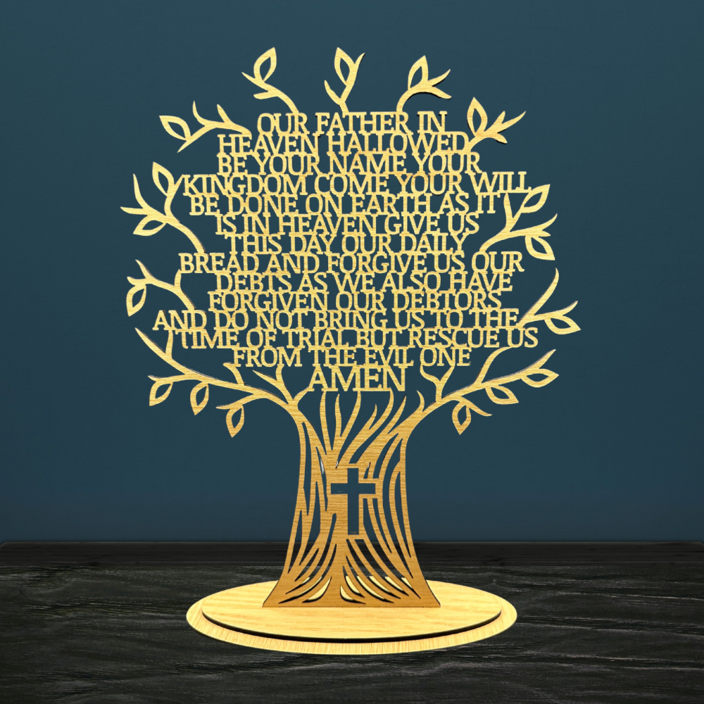 Faith and craftsmanship come together beautifully in this Lord’s Prayer Tree of Life tabletop display. Each piece is laser-cut from 1/8-inch veneer wood and features the full text of the Lord’s Prayer woven into the branches of a symbolic tree with a cross at its base.